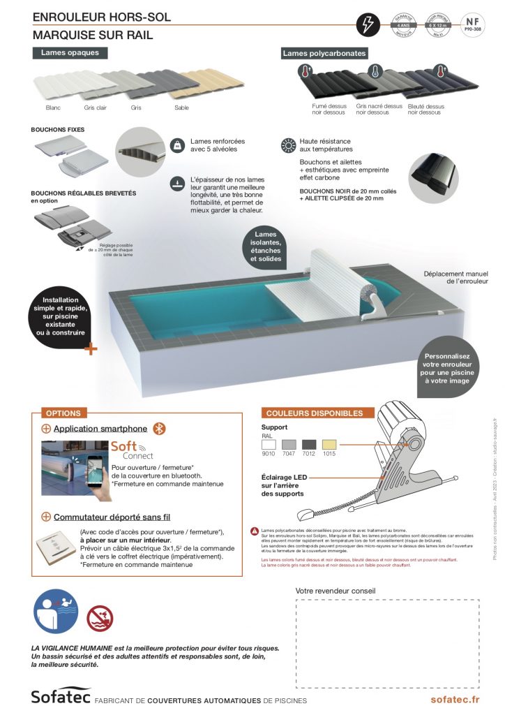 Le modèle Marquise sur rail est une couverture automatique pour piscines hors-sol. Il est conçu pour s’adapter à des bassins existants ou à construire jusqu’à 6,00 x 12,00 m. Il est équipé d’un moteur avec fin de course électronique pour un fonctionnement automatisé et peut être débrayé manuellement en cas de coupure électrique pour garantir la sécurité de la piscine. L’installation est simple et rapide.